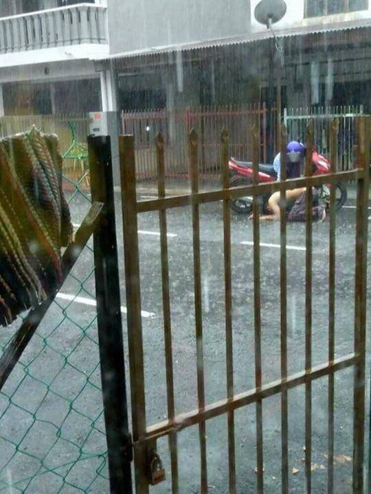 Sang wanita yang dikala itu sedang di atas sepeda motor, terlihat juga berusaha untuk membuat si pemuda berdiri.